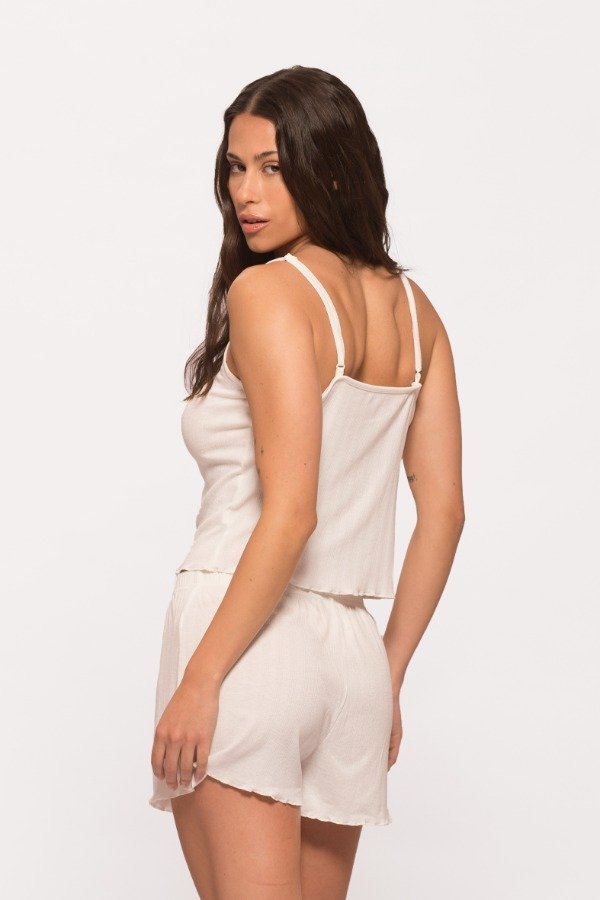 Musculosa con breteles regulables del mismo textil, tiene detalle en escote con elástico rey y moño y tmabién, terminación con rulote