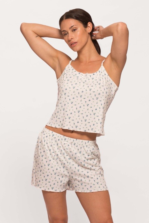 El short es de cintura con elástico de 30 mm, embutido, con detalle de moño y terminación con rulote